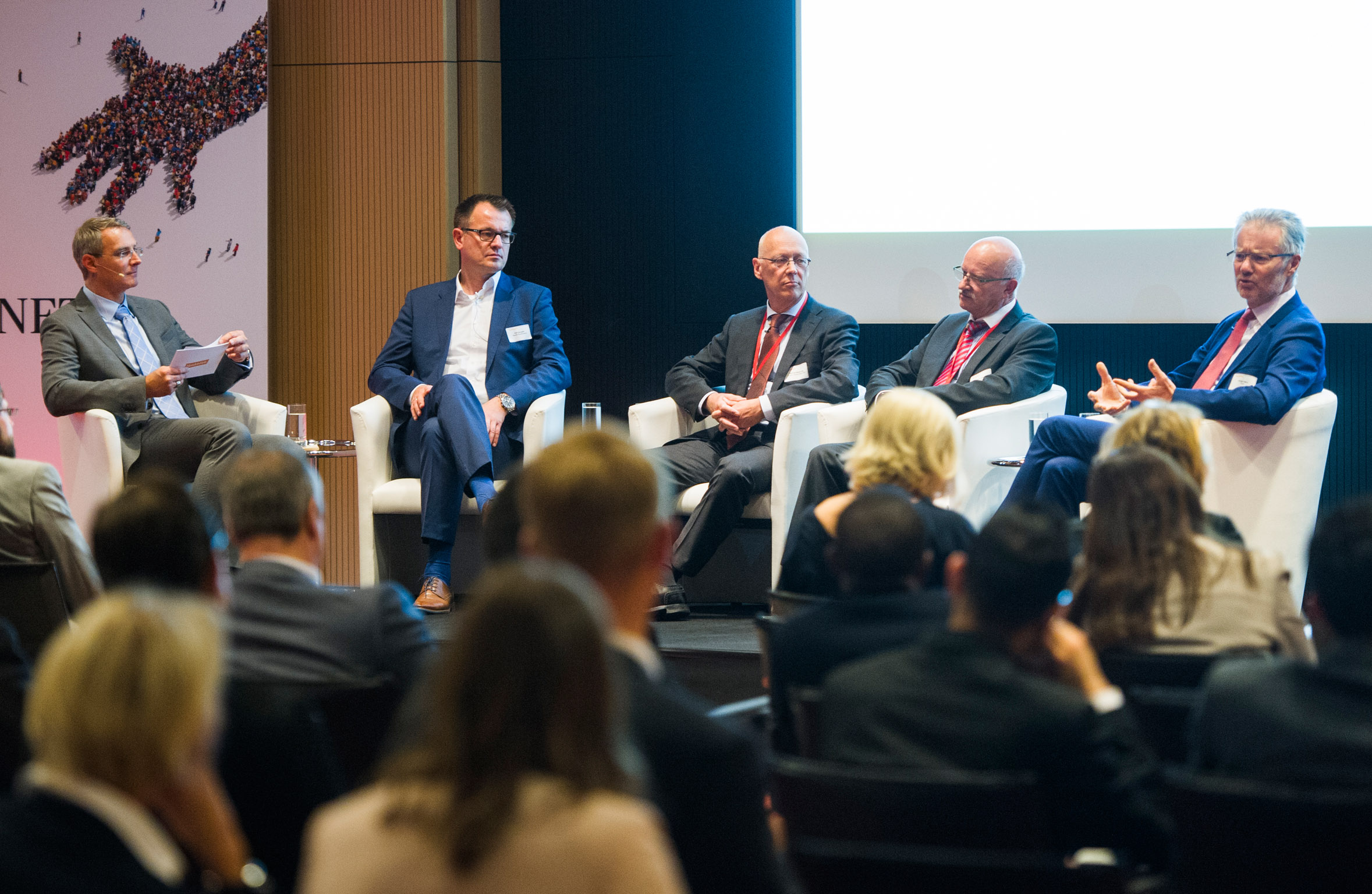 V.l.n.r.: Grischa Brower-Rabinowitsch, Moderator des Abends und Ressortleiter Unternehmen & Märkte, Handelsblatt; Ralf Hengels, stellv. Leitung Personal und stellv. Vorstandsmitglied, Nestlé Deutschland; Michael Bräuning, Leiter des Projektbüros Integrations-Offensive und Direktor, Allianz Deutschland; Friedemann Hensgen, Vorsitzender des Vorstands, Rittal Foundation; Alfred Höhn, Industry Leader Öffentlicher Sektor EMEA, PwC.